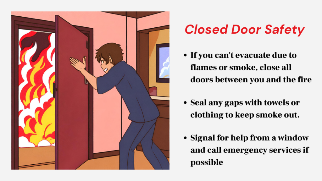 If you can’t evacuate due to flames or smoke, close all doors between you and the fire. Seal any gaps with towels or clothing to keep smoke out. Signal for help from a window and call emergency services if possible.
